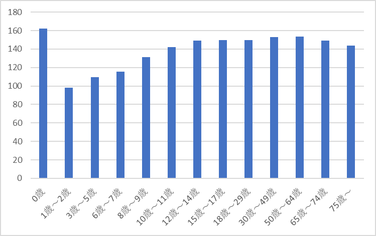 0歳では高いものの、1歳〜9歳頃までは、他の年代と比べると明らかに低い水準にあります。