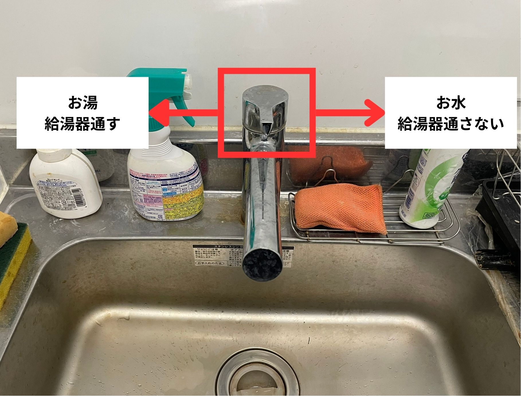 蛇口を左にひねると給湯器を通ったお湯が出て、右にひねると給湯器を通らない水道水が出る、という仕組みになっているそうです。