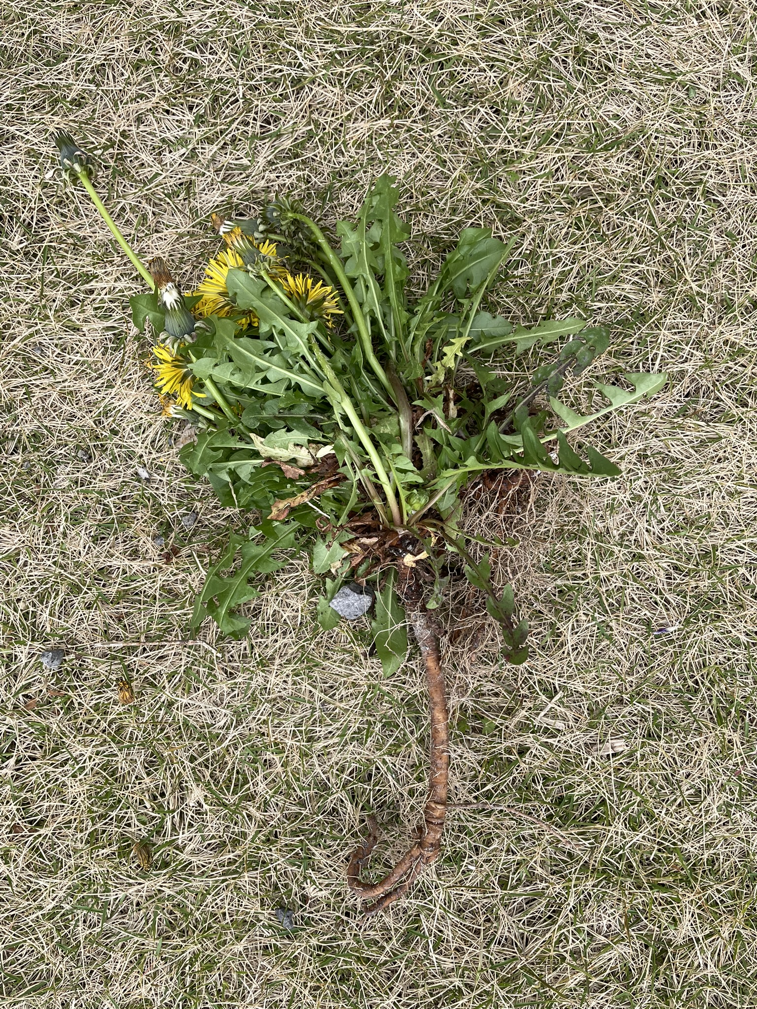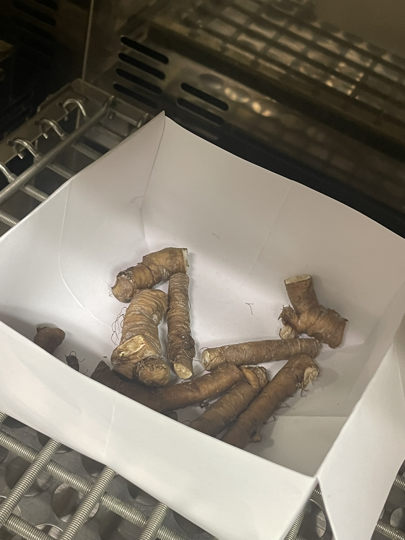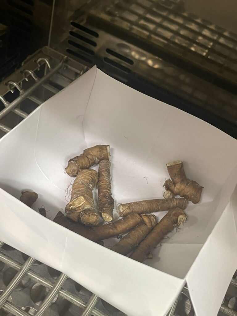 乾燥させる前のタンポポの根は枝のよう、生姜やゴボウにも見えます。